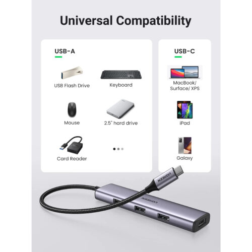 Maximize your productivity with the UGREEN USB-C to 4-Port USB 3.0 Hub (CM473, UG-20841). Enjoy 5 Gbps data transfer speeds and plug-and-play convenience. Perfect for MacBooks, Chromebooks, and USB-C laptops.
